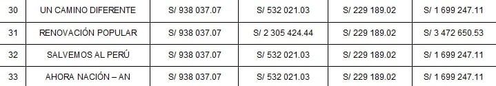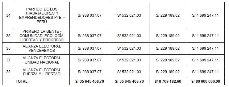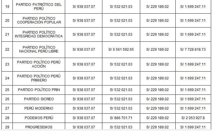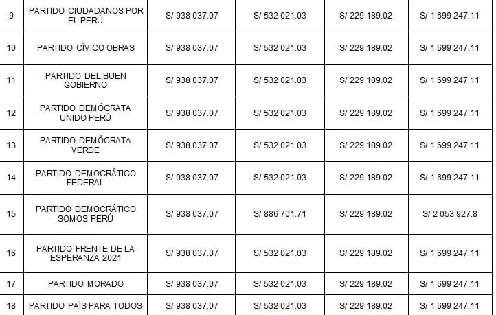 La primera parte se repartió de manera igualitaria entre todas las organizaciones políticas, asignando a cada una el importe de S/ 938,037.07.