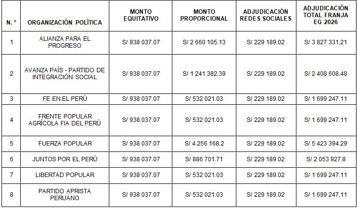 La Oficina Nacional de Procesos Electorales (ONPE), mediante la Resolución Jefatural n. ° 000202-2025-JN/ONPE, estableció la asignación de S/ 80 millones para la franja electoral correspondiente a las Elecciones Generales 2026. El monto se ha distribuido entre las 38 organizaciones políticas que han solicitado la inscripción de sus candidaturas ante el Jurado Nacional de Elecciones (JNE) hasta el plazo establecido del 23 de diciembre de 2025.