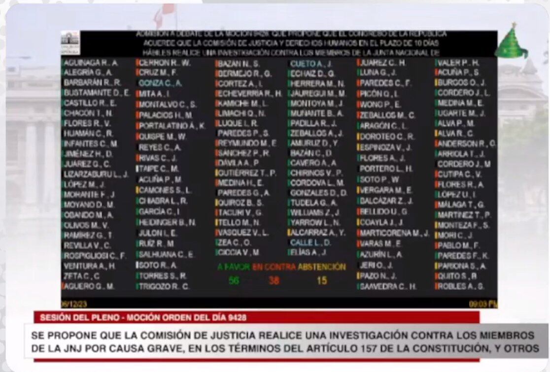 En total fueron 56 votos a favor, 38 en contra y 15 abstenciones. Como se recuerda, esta propuesta fue motivada por el congresista Esdras Medina, quien solicitó dicha medida en contra de los magistrados por el caso “La fiscal y su cúpula”, en donde se señala a la titular del Ministerio Público ser líder de una presunta organización criminal.