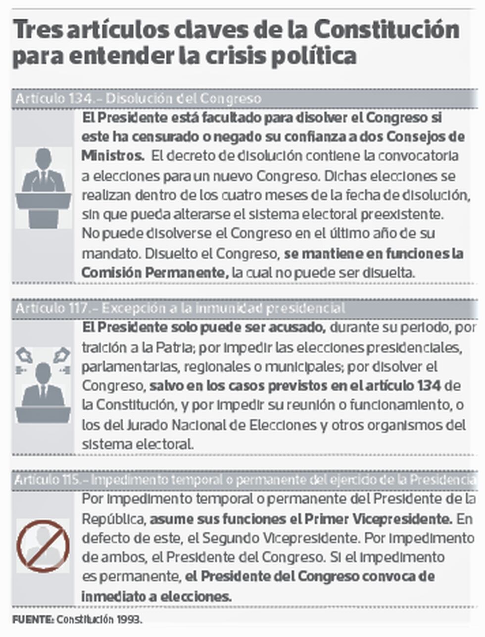 El Perú afronta una grave crisis constitucional. Por un lado, Martín Vizcarra disolvió el Parlamento, aceptó la renuncia de su Gabinete y nombró como nuevo titular de la Presidencia del Consejo de Ministros a Vicente Zeballos. Todo sucedió en menos de cinco horas. Se basó en el artículo 134 de la Carta Magna, como lo señaló en su mensaje a la Nación.