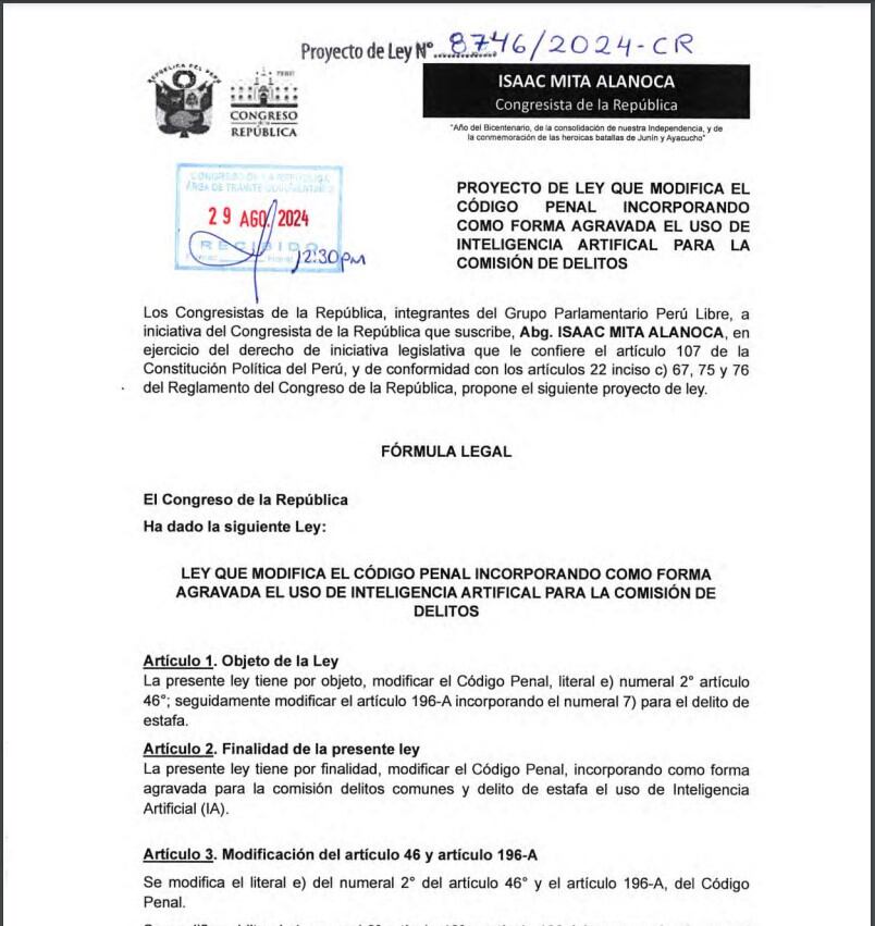 En la exposición de motivos del proyecto de ley que promueve desde la bancada de Perú Libre se indica que, actualmente “pese a que los delitos informáticos sí están contemplados en el Código Penal vigente, el recurso de la IA carece de regulación”.