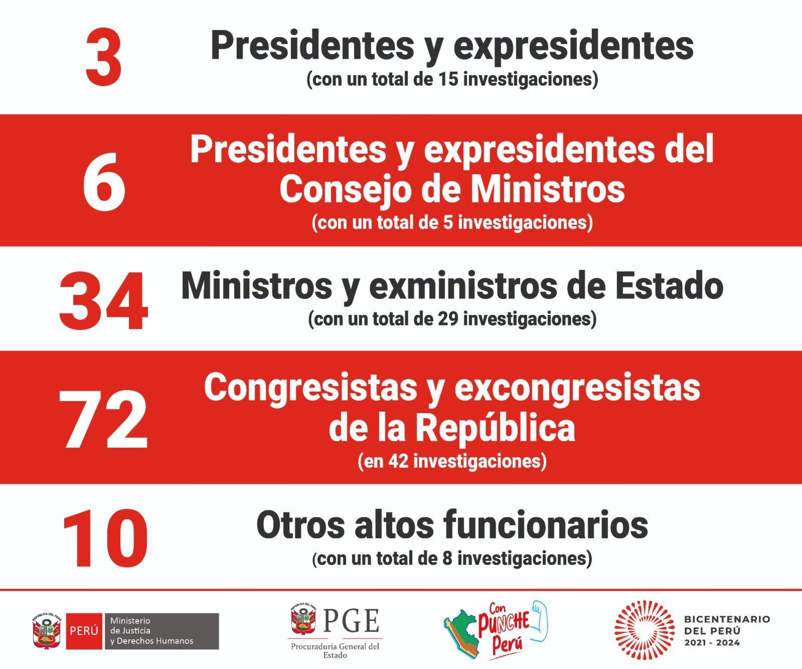 En la lista también figuran seis presidentes y expresidentes del Consejo de Ministros (5 investigaciones), 34 ministros y exministros (29 indagaciones) y 72 congresistas y excongresistas (42 investigaciones).