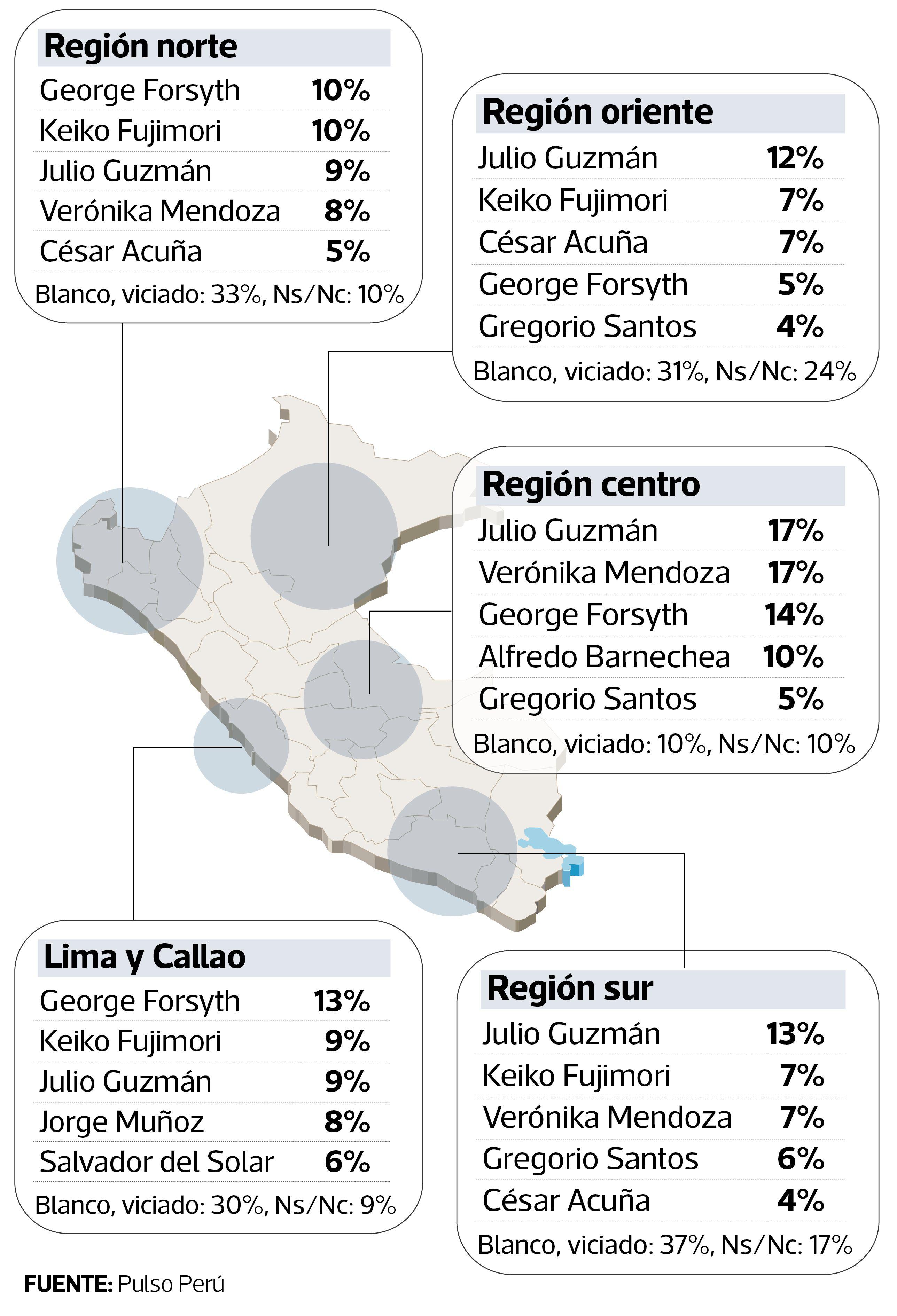 Julio Guzmán, del Partido Morado, tiene un 11% de intención de voto y además lidera en tres de las regiones del país (sur, centro y oriente).