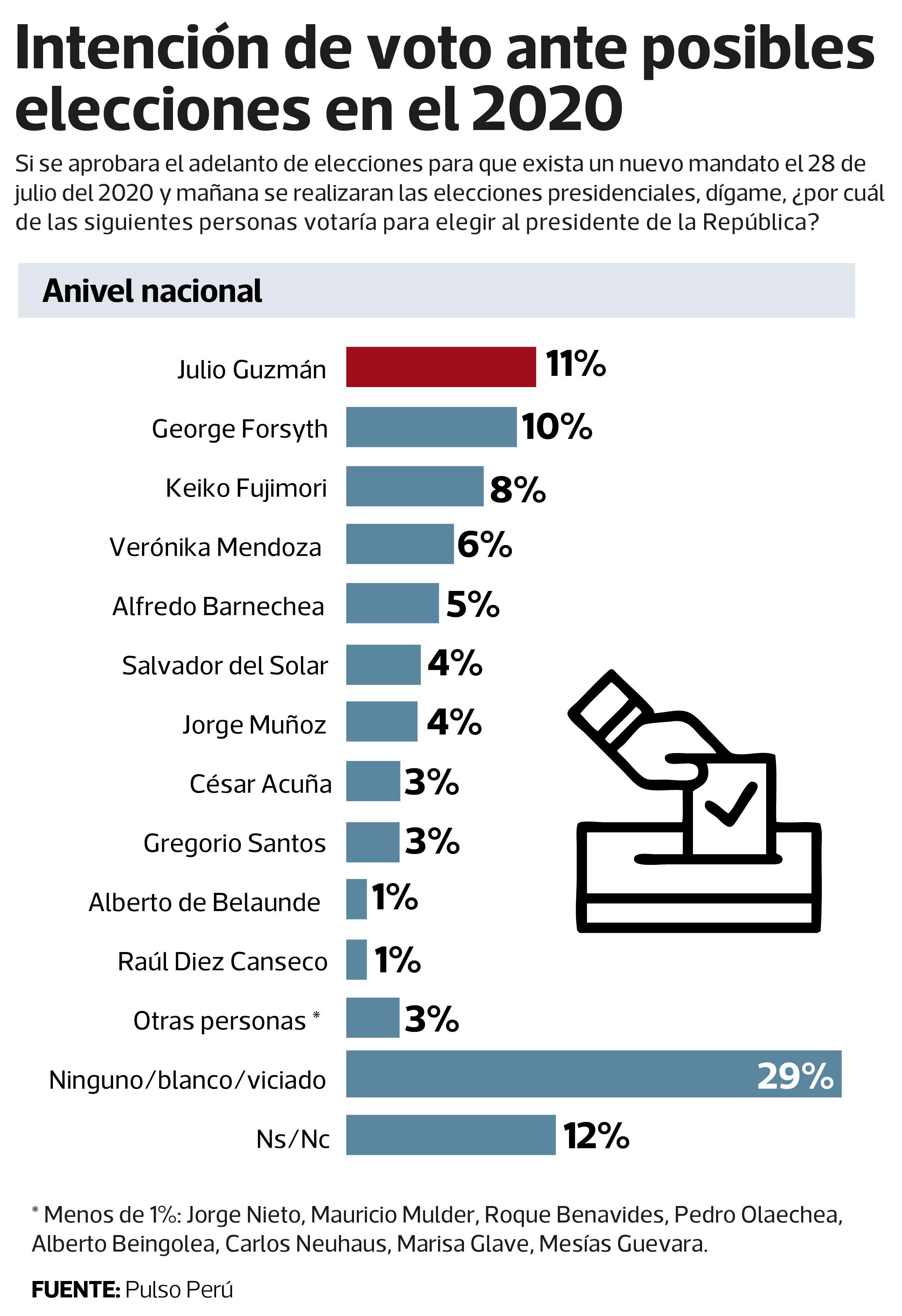 Frente a un posible de adelanto de elecciones, la ciudadanía parece mostrar aún dudas sobre el menú de candidatos para la Presidencia . Basta saber que el 29% de los peruanos votaría blanco o viciado. Es más, hay un 12% que no sabe ni no opina frente a un nuevo escenario electoral. Es decir, un 41% no tiene candidato.