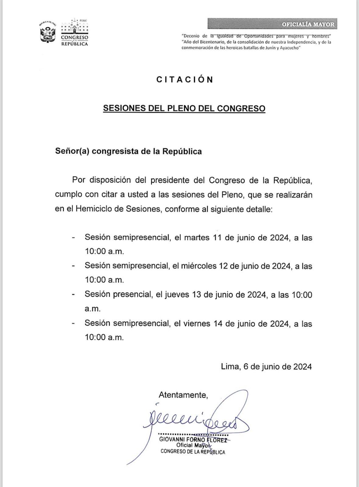 “Que en la sesión realizada el 6 de junio de 2024 se realizó una votación fraudulenta respecto a la votación de la cuestión previa que proponía el retorno de la dictamen que plantea la reforma del sistema de pensiones”, sostiene el documento.
