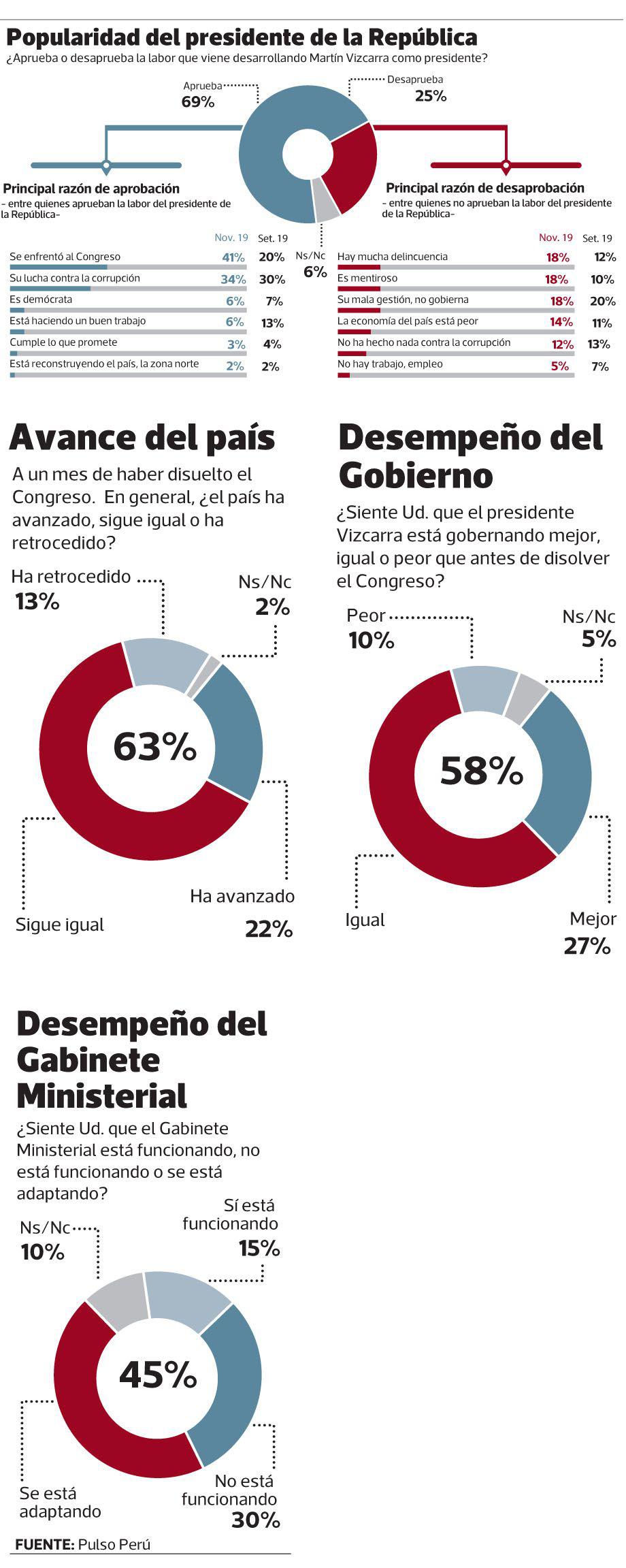 La disolución del Congreso parece haber dejado al presidente Martín Vizcarra en la mira de la ciudadanía. A poco más de un mes, el 63% de los peruanos sostiene el país continúa igual luego de la medida.