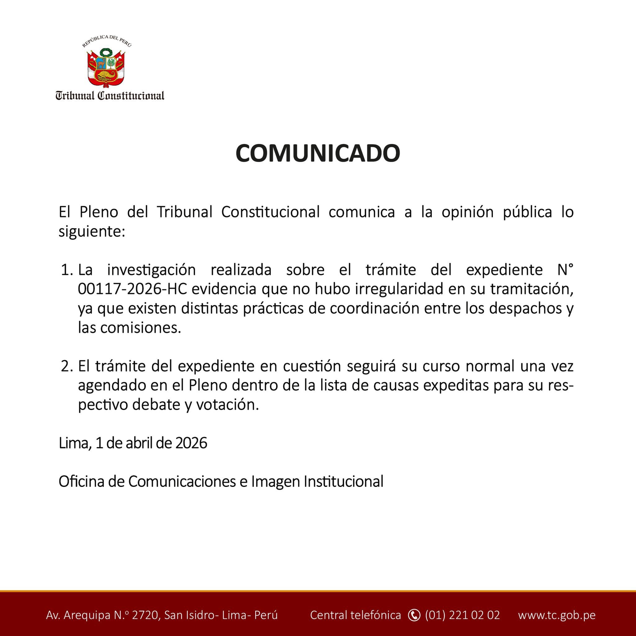 El Tribunal Constitucional (TC) emitió un comunicado oficial en el que asegura que no se detectaron irregularidades en el proceso del expediente N° 00117-2026-HC, relacionado con el líder político Vladimir Cerrón.
