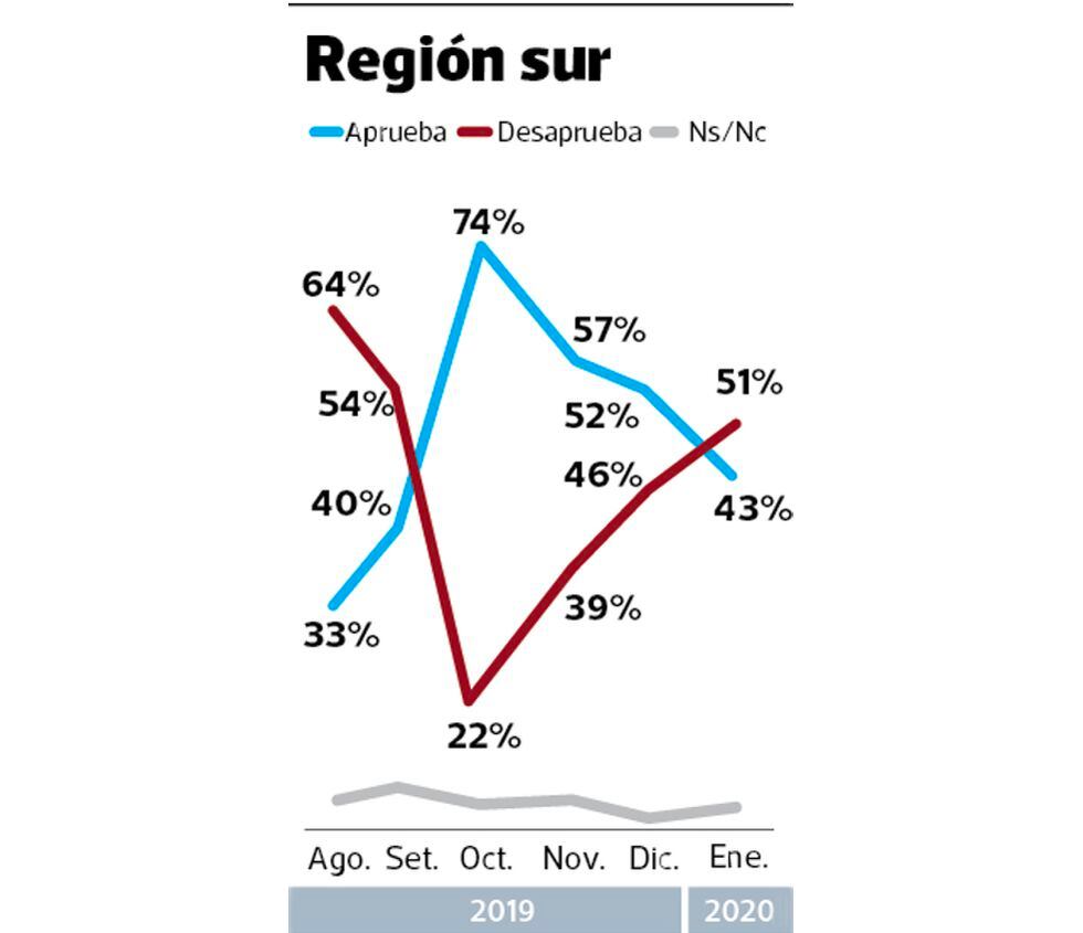 El sur del país es un caso aparte, pues allí Vizcarra cayó de 52%a 43%. Pero no solo eso, pues esta es la única zona del Perú donde su rechazo (51%) supera a su aprobación.