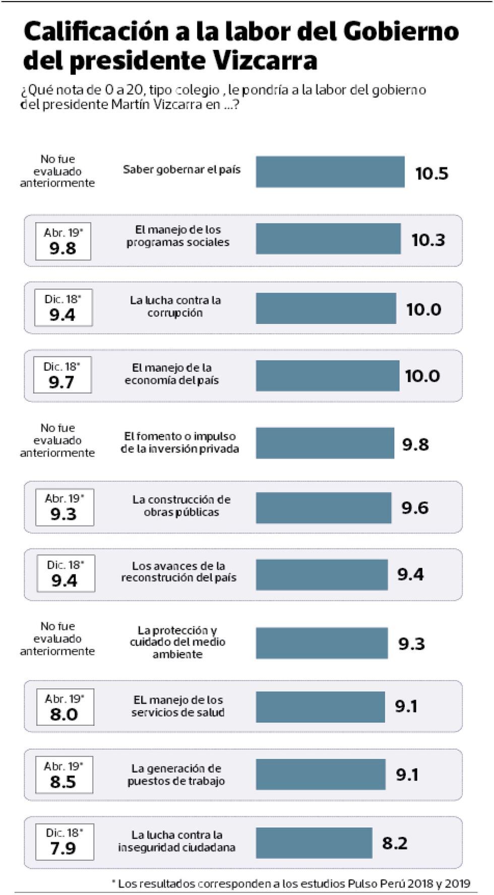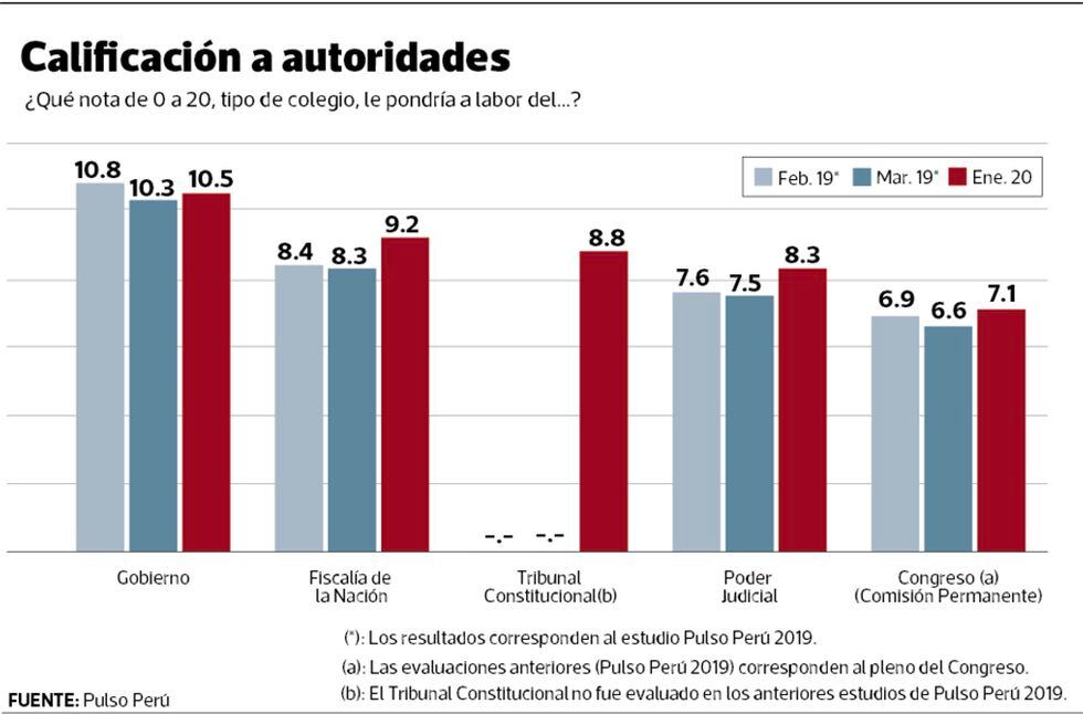 Cinco instituciones o poderes públicos recibieron nota – tipo colegio – desde la ciudadanía. Todos, con excepción del gobierno, desaprueban. El Gobierno recibe 10.5. En marzo del 2019, tuvo 10.3.
