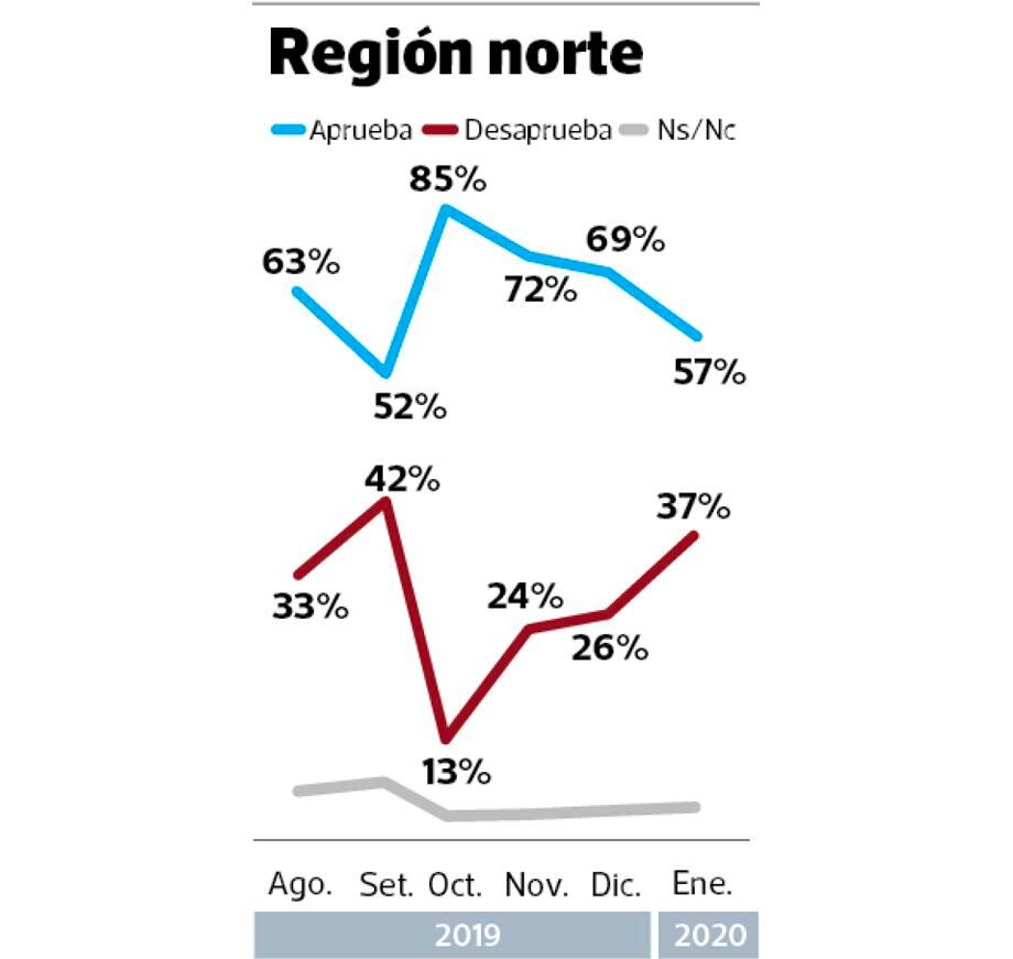 A nivel de regiones, la caída se produjo en todas con excepción del oriente, donde su popularidad subió de 59% a 61%.