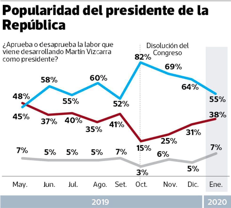 El presidente Martín Vizcarra arranca el año con 55% de popularidad. Sin embargo, el movimiento de los números del jefe de Estado revela otra realidad: es el tercer mes consecutivo en que cae y en estos 90 días ya perdió 27 puntos porcentuales.