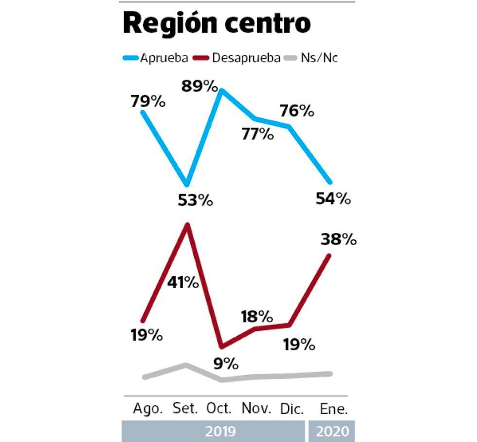 El principal retroceso de Vizcarra se produjo en el centro del país, donde pasó de 76% (su aprobación más alta en diciembre) a 54%.