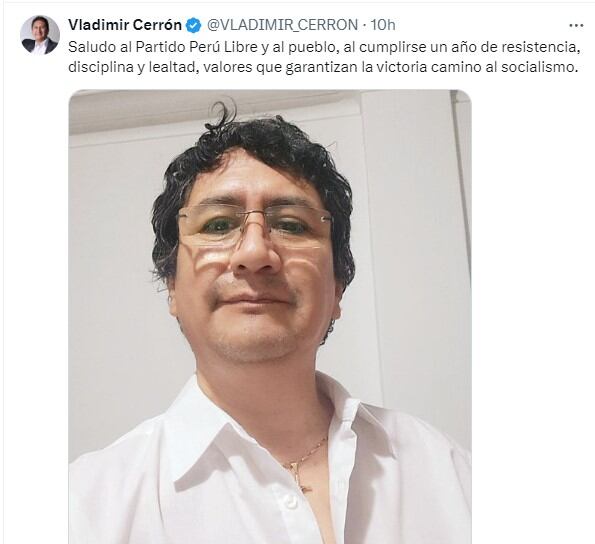“Saludo al partido Perú Libre y al pueblo, al cumplirse un año de resistencia, disciplina y lealtad, valores que garantizan la victoria camino al socialismo”, escribió el exgobernador de Junín, informó Willax TV.