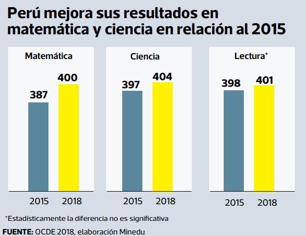 En este caso, superó a Colombia, Brasil, Argentina, Panamá y República Dominicana. En este caso, nuestro país tuvo la mejora más importante respecto al resultado de la prueba anterior (13 puntos). Pero la mayoría (60.3%) de alumnos alcanzó resultados que los colocan en el nivel 1 (en la prueba del 2018).