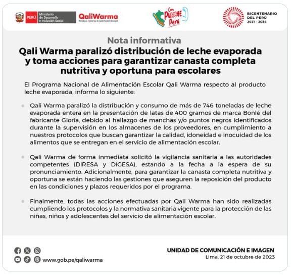 El Programa Nacional de Alimentación Escolar Qali Warma informó que paralizó la distribución y consumo de más de 746 toneladas de leche evaporada a fin de garantizar la calidad de los alimentos que se entregan a los millones de escolares.