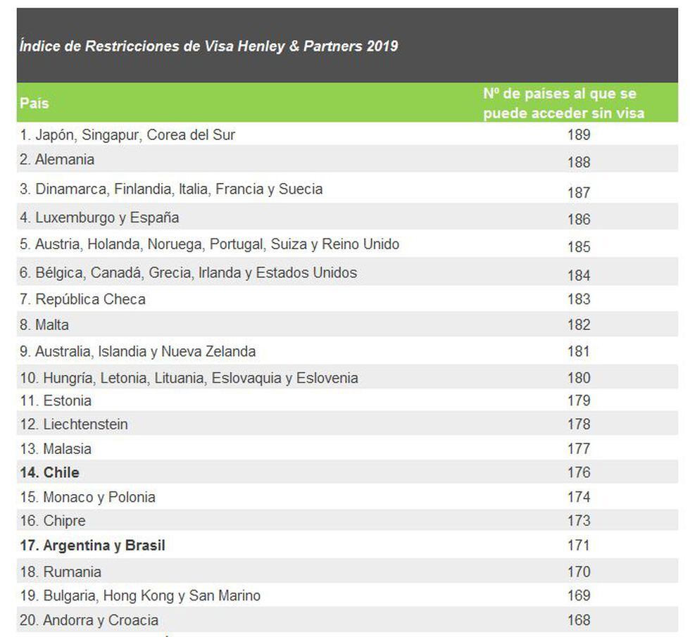Según el informe de la consultora internacional, que cada año publica su "Passport Index" (Índice del pasaportes), en 189 países no le exigen visa a los japoneses, singapurenses y surcoreanos.