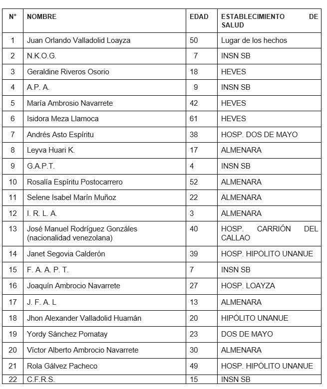 De acuerdo con el sector, este sábado falleció un menor de 15 años de iniciales C.F.R.S., quien estaba internado en el Instituto Nacional de Salud del Niño San Borja. A este caso se le suma la muerte de Rola Gálvez Pacheco (49) quien perdió la vida el pasado jueves en el hospital Hipólito Unánue.