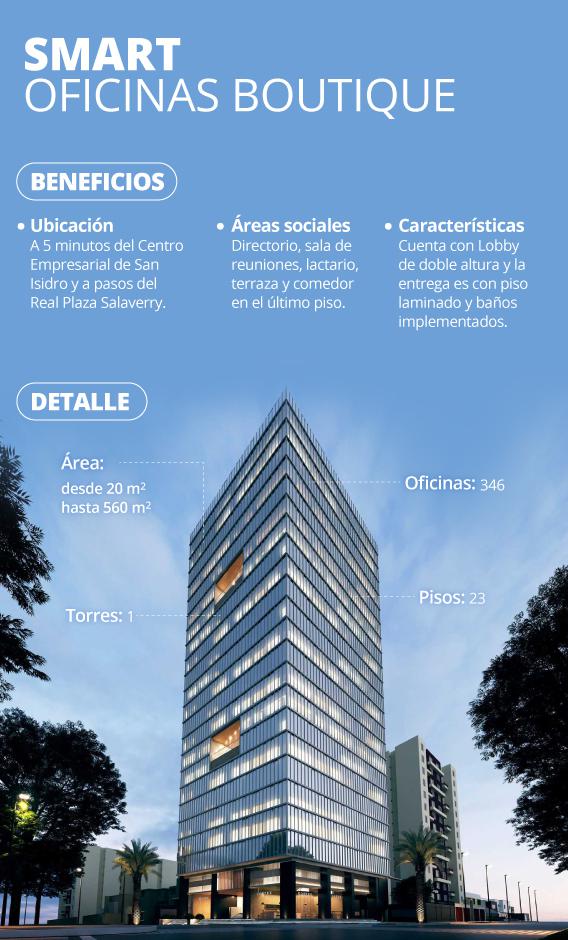 Ubicado en la avenida Faustino Sánchez Carrión 790 (Ex Pershing), en Magdalena, este nuevo proyecto inmobiliario tiene ambientes desde 20 m2 hasta 79 m2. Las oficinas de Smart son ideales para emprendedores o trabajadores independientes como abogados, arquitectos, doctores, entre otros; les brinda la posibilidad de que su empresa proyecte una imagen sofisticada al pertenecer a un edificio corporativo de primer nivel. Además, es una excelente oportunidad de inversión, dado que el retorno que ofrecen las oficinas es más rentable que el de viviendas.