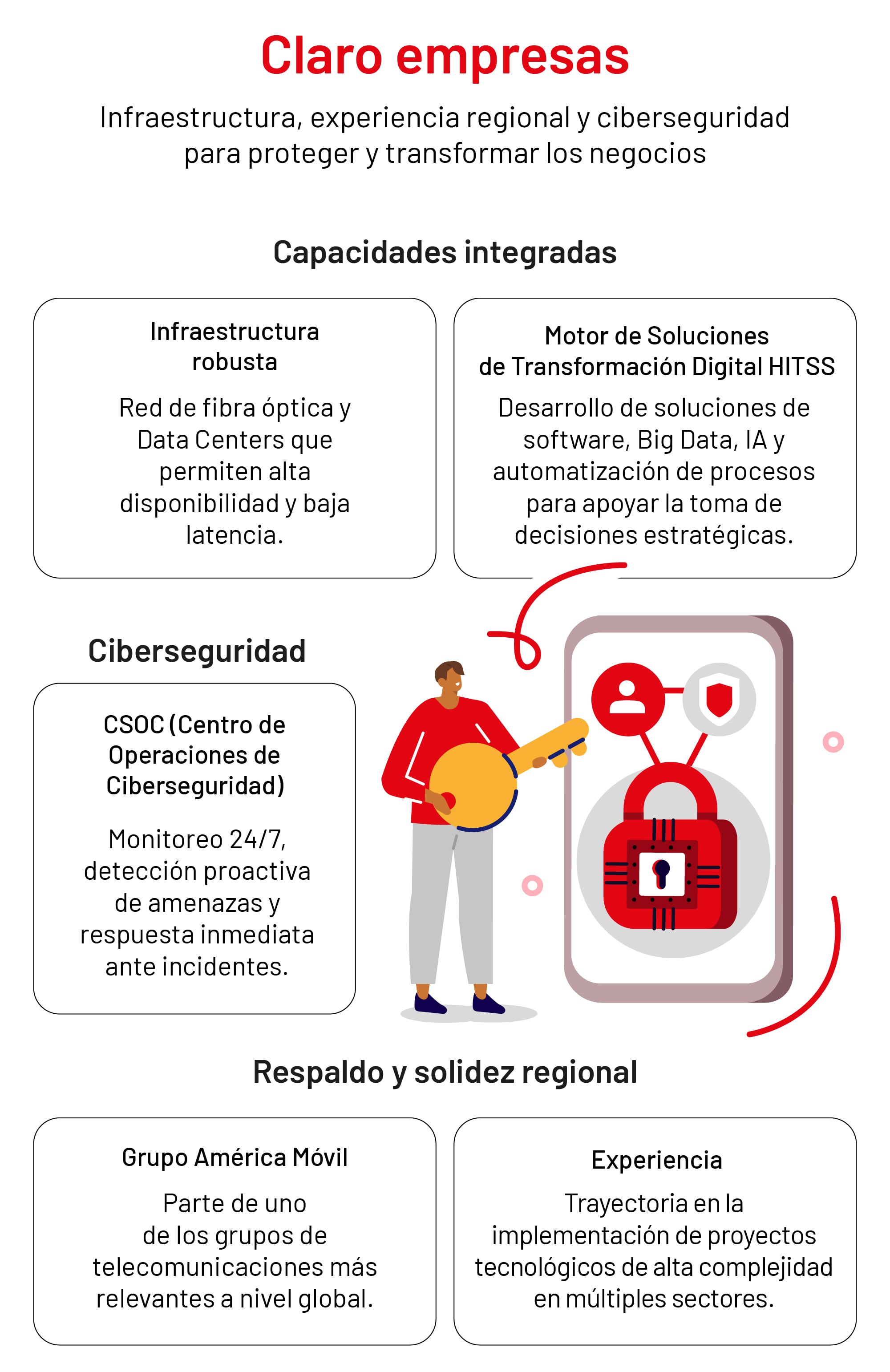 Frente a este escenario, Claro empresas consolida una propuesta que integra ciberseguridad, infraestructura y ejecución tecnológica especializada como un solo enfoque. Desde su rol como integrador y arquitecto tecnológico, articula capacidades propias y especializadas para fortalecer tanto la ciberseguridad como la eficiencia operativa de las organizaciones.