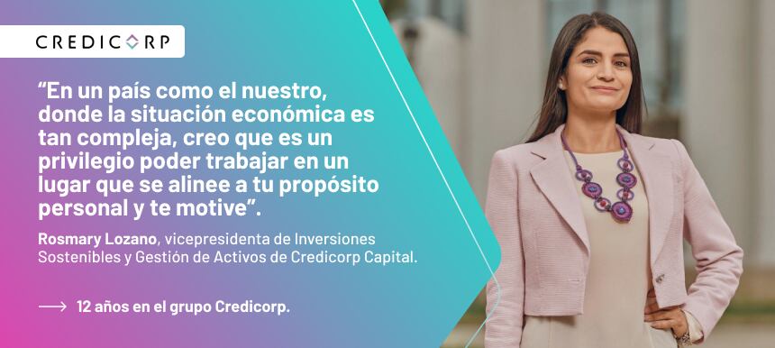 Un buen lugar para trabajar es más que un espacio agradable. Es, de acuerdo con Rosmary Lozano, Vicepresidenta de Inversiones Sostenibles y Gestión de Activos de Credicorp Capital, la organización que te impulsa a crecer con propósito. O, en otras palabras, donde tienes la posibilidad de alinear tus objetivos personales con los de la empresa para aportar a la sociedad y el mundo.