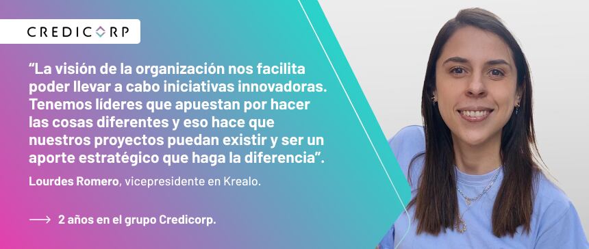 La creatividad permite innovar, encontrar formas de hacer negocios con nuevas tecnologías, mejorar procesos con ideas disruptivas. Para activar el ADN innovador es necesario un entorno laboral creativo, que impulse a los talentos a desafiar los límites. Así lo destaca Lourdes Romero, Vicepresidenta en Krealo, Corporate Venture Capital de Credicorp: “Nosotros vivimos la creatividad y la innovación en el día a día. Tenemos una cultura horizontal, somos colaborativos, nos retamos a aprender del error y celebramos el éxito, porque así hacemos que las cosas sucedan”.
