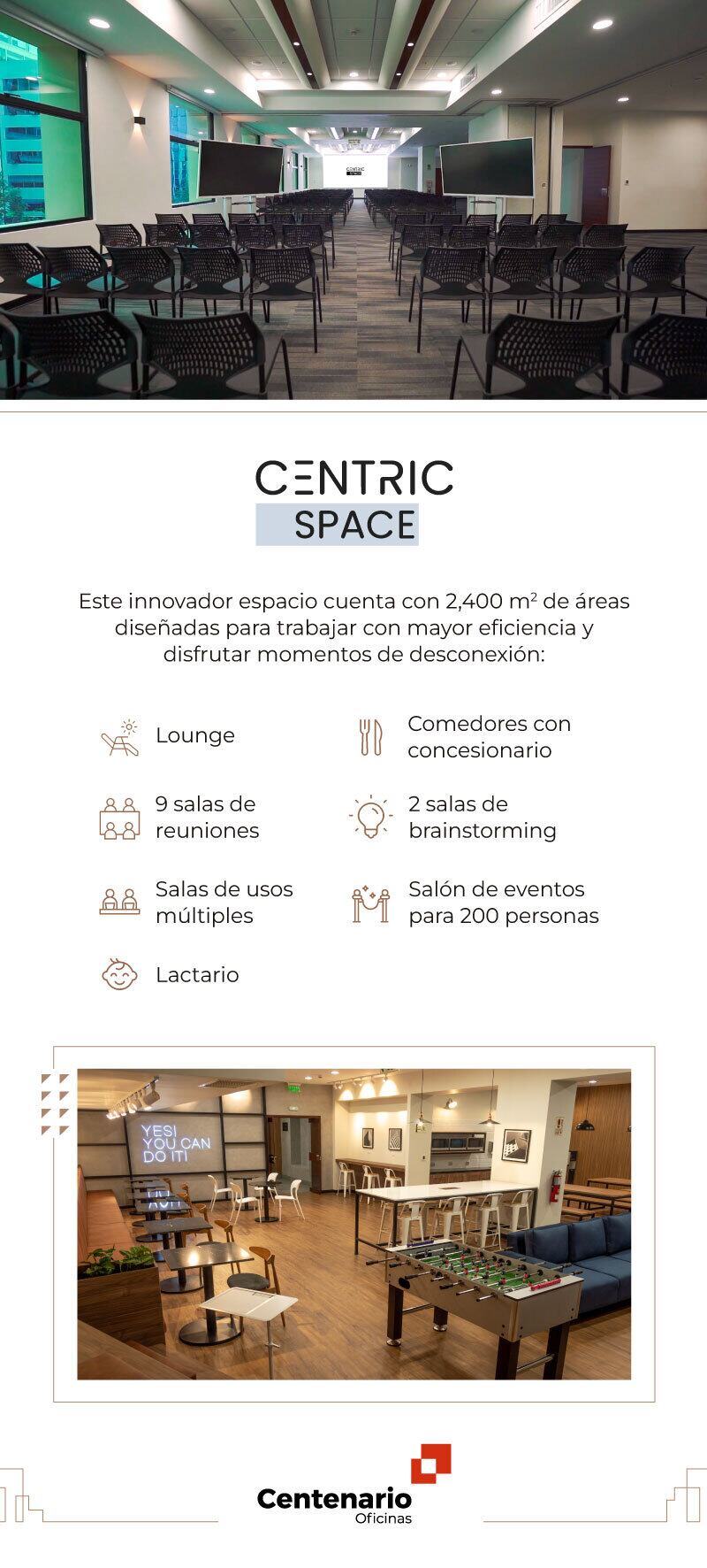 Centenario Oficinas ha lanzado al mercado el Centric Space, un producto inédito en el circuito inmobiliario de nuestro país. Se trata del más grande espacio de ‘amenities’ y servicios de un complejo de oficinas en Perú, disponible para el uso de todos los clientes de Centenario Oficinas en el Centro Empresarial Real de San Isidro, donde está ubicado.