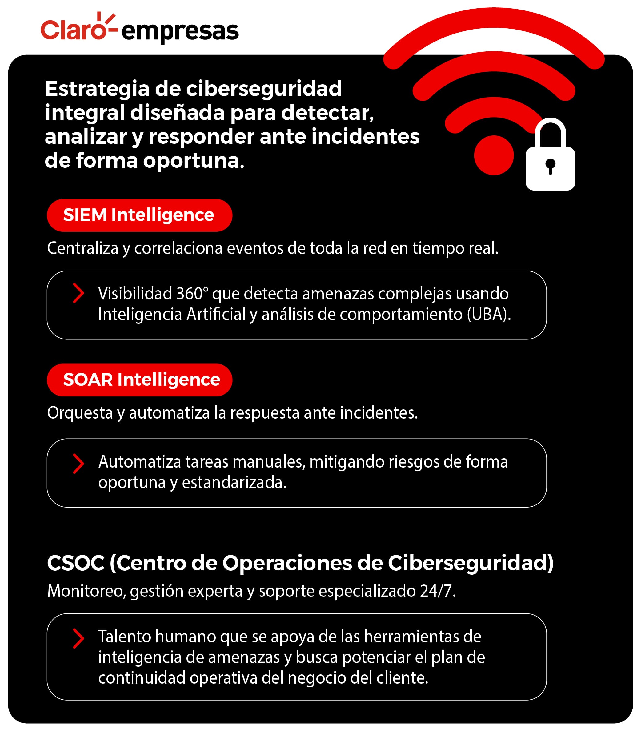 En un contexto de evolución de los ataques de ciberseguridad, Claro empresas se posiciona como un aliado estratégico en la gestión avanzada de amenazas digitales, integrando dos capacidades clave dentro de una estrategia integral de ciberseguridad: SIEM (Gestión de Información y Eventos de Seguridad) y SOAR (Orquestación, Automatización y Respuesta de Seguridad).