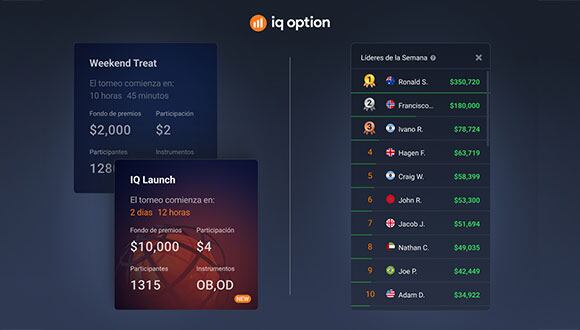 - Torneos de trading. IQ Option organiza periódicamente concursos, muchos de los cuales son gratuitos o de bajo coste. Los participantes utilizan capital virtual y tienen la oportunidad de obtener recompensas reales. Los premios pueden ascender a varias decenas de miles de dólares, enriqueciendo no sólo la experiencia, sino también los bolsillos.