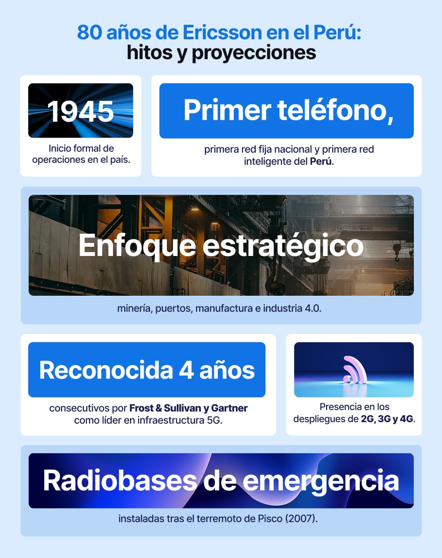 Durante la celebración, Andrés Pirela, general manager de Ericsson Perú, destacó que la evolución de la compañía en el país inició con la telefonía fija. “Ericsson trajo el primer teléfono al Perú, desarrolló la primera red nacional de telefonía fija y también la primera red inteligente”, señaló. La empresa participó en despliegues de 2G, 3G y 4G, así como en operaciones de emergencia como las radiobases instaladas tras el terremoto de Pisco en 2007, uno de los hitos más recordados internamente.