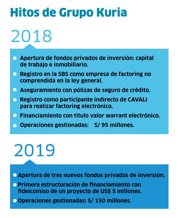 En 2013, este grupo inició sus operaciones como una consultora financiera. Actualmente, los fondos privados de inversión forman parte clave de su propuesta de valor. Así, Grupo Kuria administra hoy fondos por US$ 20 millones (de capital de trabajo, de factoring, inmobiliarios y equity). Asimismo, cuenta con un respaldo de coberturas por US$ 25 millones y tiene 250 inversionistas.