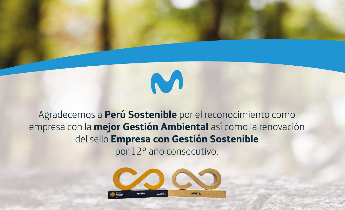 Movistar fue ganadora de la categoría ambiental en el reconocimiento Empresa con Gestión Sostenible (EGS), edición 2022. Este sello, otorgado a la compañía por 12º año consecutivo, es impulsado por la organización Perú Sostenible, la cual reconoció el pasado 6 de julio en una ceremonia presencial a las empresas que superaron el puntaje establecido para la edición en curso. Asimismo, anunció a las 5 empresas que lograron una puntuación destacada en las siguientes categorías: Ética e Integridad, Medio Ambiente, Inclusión y Diversidad, Cadena de Valor de Impacto y PYME.