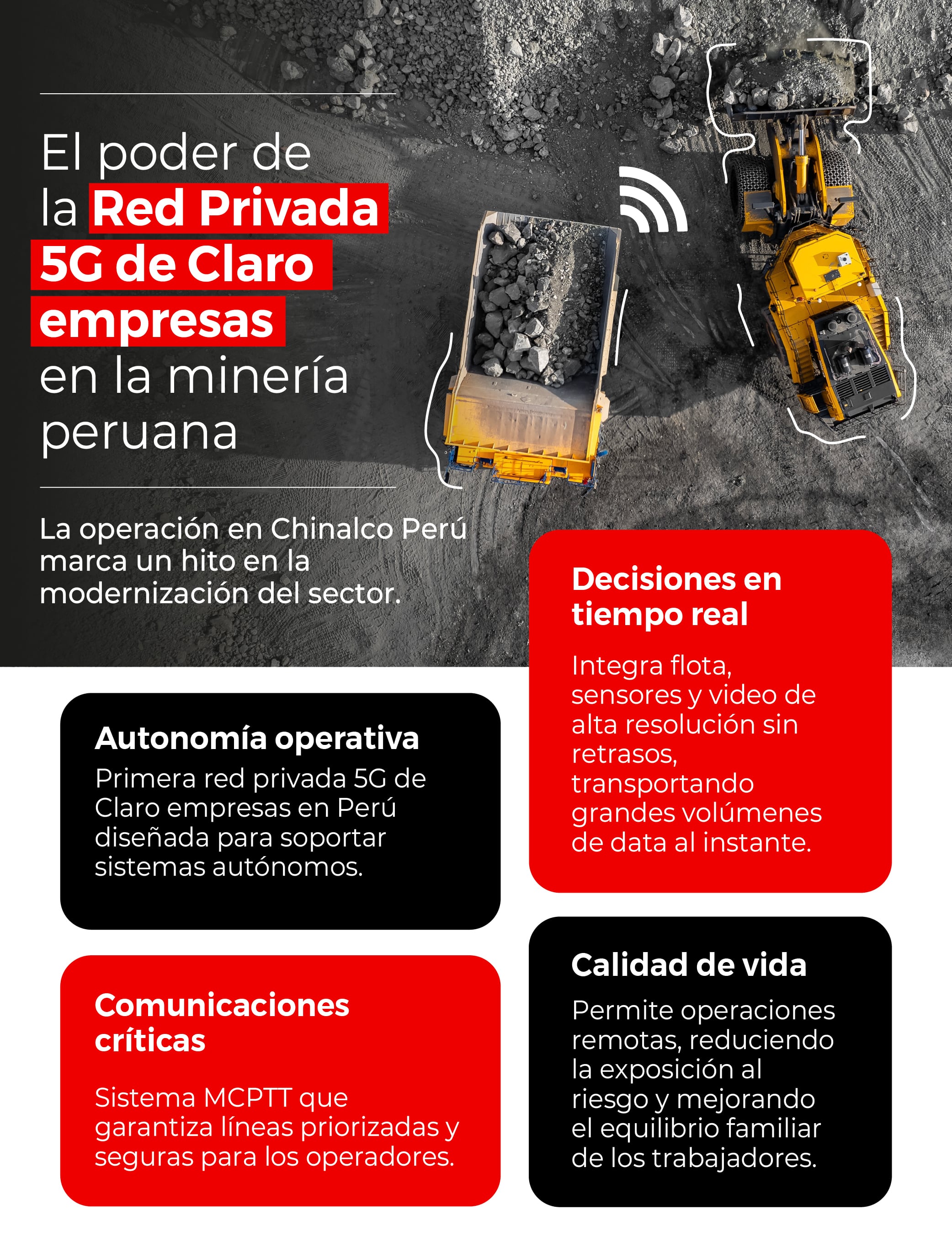 Se trata de la primera red privada 5G implementada por Claro empresas en el país concebida para soportar la operación de sistemas autónomos en minería, marcando un hito para la actividad comercial de la compañía en el sector.
