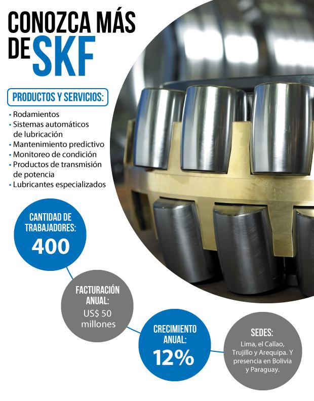 “Somos la empresa sueca con más años en el país. Atendemos directamente a las grandes industrias como agroindustria, minería, pesquería, construcción, vehículos y camiones pesados y ligeros”, asegura Andrés Vera, gerente general de SKF. Y agrega que su compañía tiene oficinas en Lima, el Callao, Trujillo y Arequipa; además de gestionar los mercados de Bolivia y Paraguay.