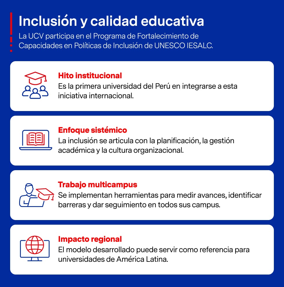 Frente a esa realidad, la Universidad César Vallejo (UCV) ha dado un paso significativo al convertirse en la primera universidad del Perú en integrarse al Programa de Fortalecimiento de Capacidades en Políticas de Inclusión de la UNESCO IESALC. Esta iniciativa busca colocar la inclusión y el bienestar universitario en el centro de la gestión institucional, como parte de una visión más amplia de calidad educativa.