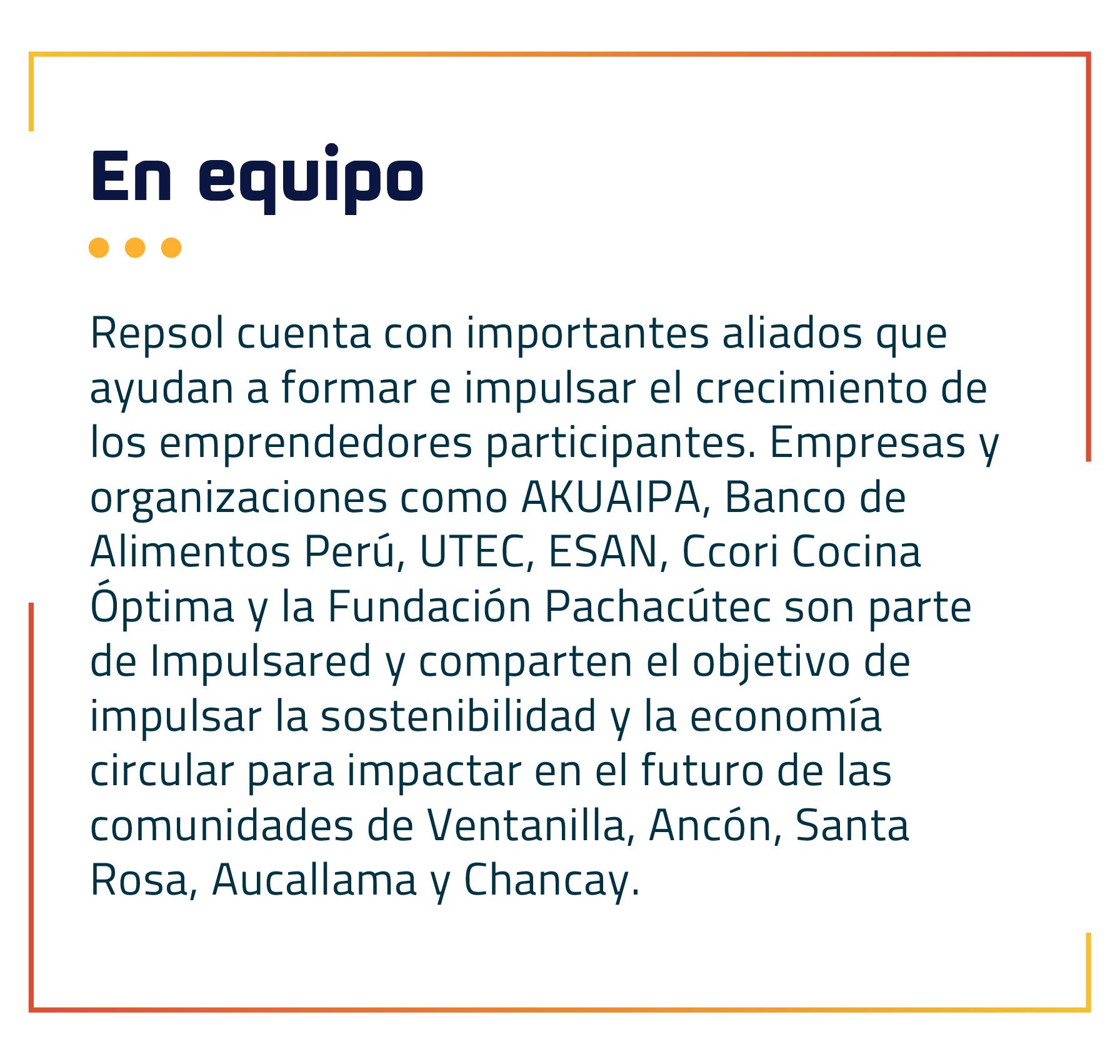 Con 30 años de operaciones en el Perú y un firme compromiso con el país, Repsol decidió apoyar a los emprendedores a través de la creación de Impulsared. Hoy en día, existen 32 nuevas empresas en Ventanilla, Ancón, Santa Rosa, Aucallama y Chancay, lo que ha transformado la vida de cientos de familias.