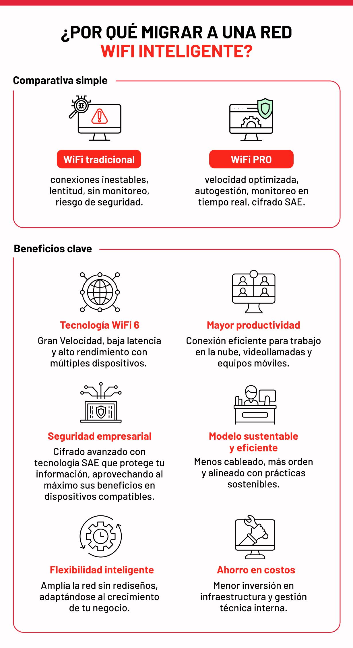 WiFi PRO está basado en tecnología WiFi 6 que incluye access points inteligentes, capaces de reducir interferencias y redirigir la señal automáticamente. Esto permite mantener una cobertura robusta, conexiones estables e, incluso, con múltiples dispositivos activos simultáneamente.