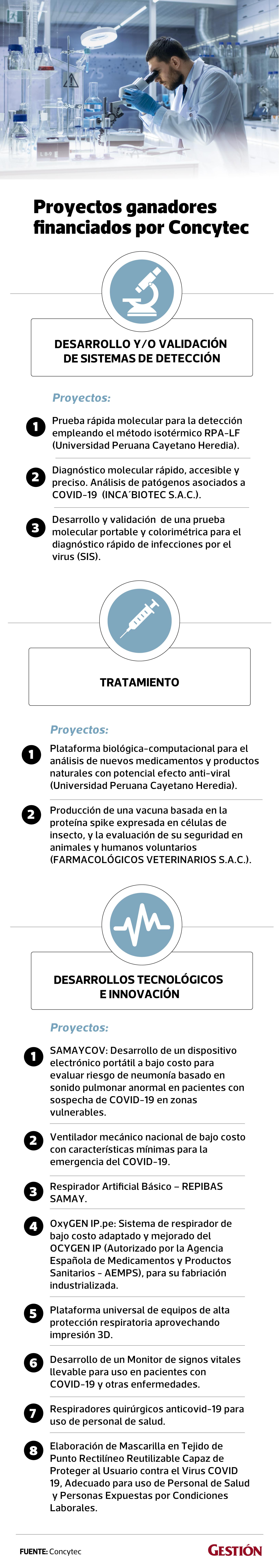 De 600 postulaciones, el órgano ejecutor Fondecyt seleccionó 29 proyectos que ofrecen soluciones efectivas y de rápido desarrollo a los desafíos sanitarios ocasionados por la pandemia. Estas son algunas de las propuestas por categorías que recibirán hasta S/ 350,000 cada una.