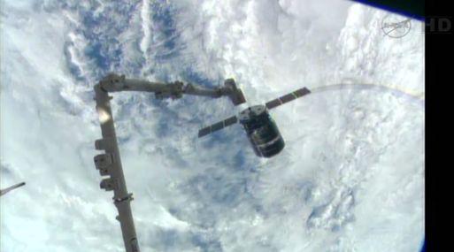 Los astronautas usaron el brazo computarizado de la EEI para sujetarla, mientras las dos naves se desplazaban a unos 420 kilómetros (260 millas) sobre el Océano Índico. Solamente otra empresa privada ha realizado otro vuelo de suministro de esa envergadura.