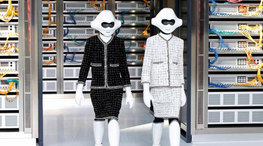 Dos modelos con cascos blancos en la cabeza que recuerdan al robot humanoide Pepper abren el desfile, luciendo el emblemático "tailleur" inmortalizado por Coco Chanel.