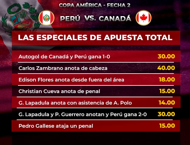 Apuesta total ofrece una serie de apuestas curiosas con cuotas atractivas para el encuentro. Por ejemplo, si la bicolor gana el encuentro por la mínima diferencia y el tanto es autogol de Canadá, la cifra ofrecida es de 30.00.