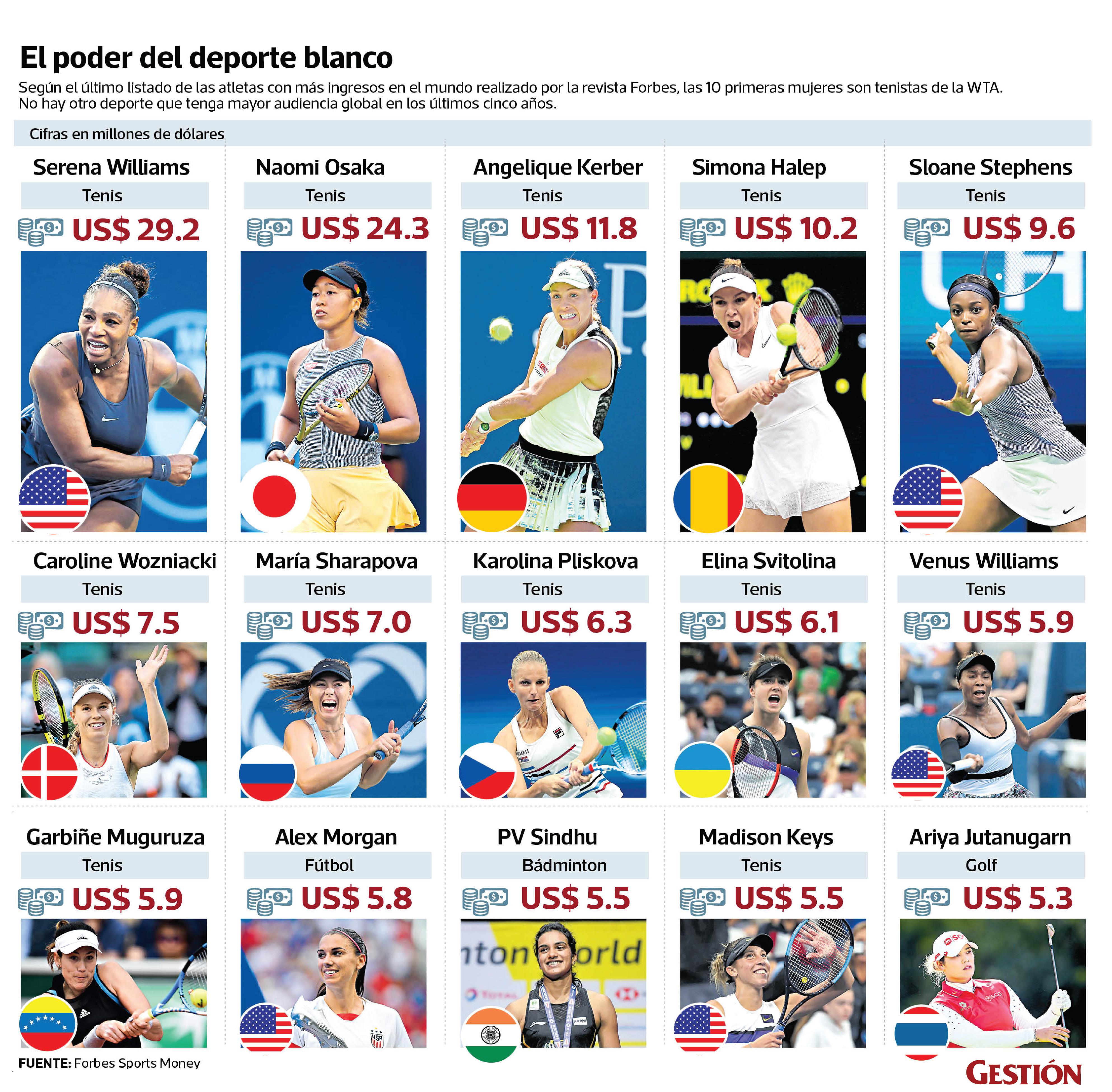 Los diez primeros puestos del ranking son ocupados también por tenistas (ver infografía). Es que “no hay otra disciplina que esté a la par del dinero que ahora reciben las jugadoras que están en la gira de la WTA, ya sea por sus ganancias en los torneos o por sus ingresos en patrocinios”, recoge el portal de El Economista.