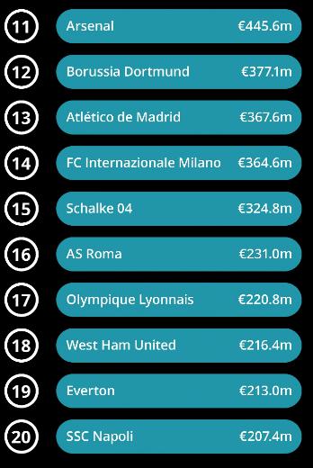 El Atlético de Madrid (13º con 367,6 millones de euros) es el otro equipo de LaLiga presente en esta clasificación.
