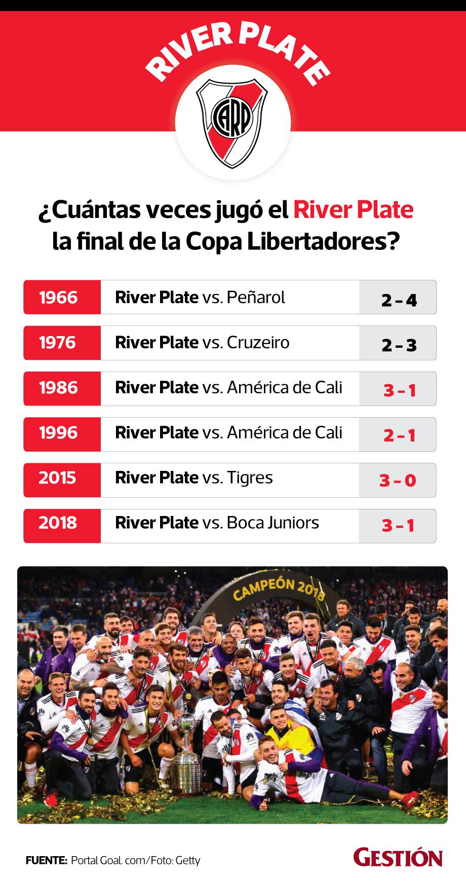 Con 118 años de historia, el River Plate jugará una final más de la Copa Libertadores este 23 de noviembre en el estadio Monumental de Ate. A lo largo de su carrera, River logró levantar este trofeo en cuatro oportunidades. Tras las derrotas en 1966 y 1976, su primera victoria sería en 1996 frente a América de Cali y la última en 2018, cuando derrotó a su clásico rival Boca Juniors con un 3-1 en Madrid.