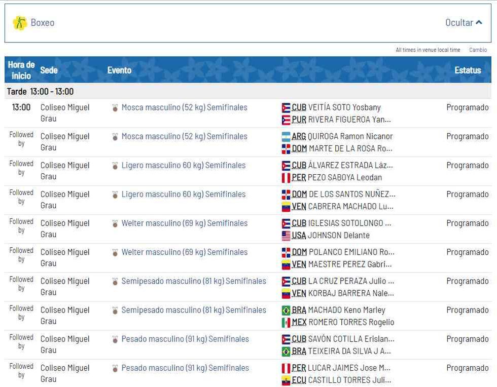 Los boxeadores nacionales Leodan Pezo y José Lucar disputarán las semifinales en las categorías de peso ligero (60 kg.) y peso crucero (91 kg), respectivamente. Los dos encuentros desarrollarán en la Villa Deportiva Regional del Callao.