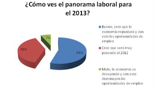 El 55% de peruanos considera que el panorama laboral del 2013 será mejor que al del año pasado, ya que creen que la economía crecerá y, junto con ello, las oportunidades de empleo, según una encuesta de Trabajando.com. En tanto, un 38% afirmó que será muy parecido al 2012, mientras que solo un 7% cree que será malo.