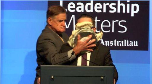 La semana pasada, Joyce estaba pronunciando un discurso en la ciudad australiana de Perth cuando un hombre vestido de traje irrumpió en el escenario y le estampó en la cara una tarta de limón con merengue.