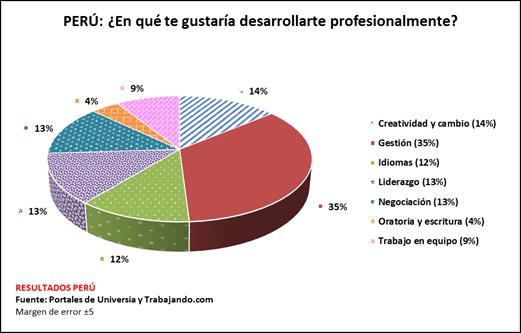 Entre las capacidades que a los peruanos les gustaría desarrollar profesionalmente, un sondeo de Trabajando.com y Universia reveló que los temas relacionados a la gestión (35%), creatividad y cambio (14%), liderazgo (13%) y negociación (13%) son vistos como los más importantes para recibir capacitaciones.