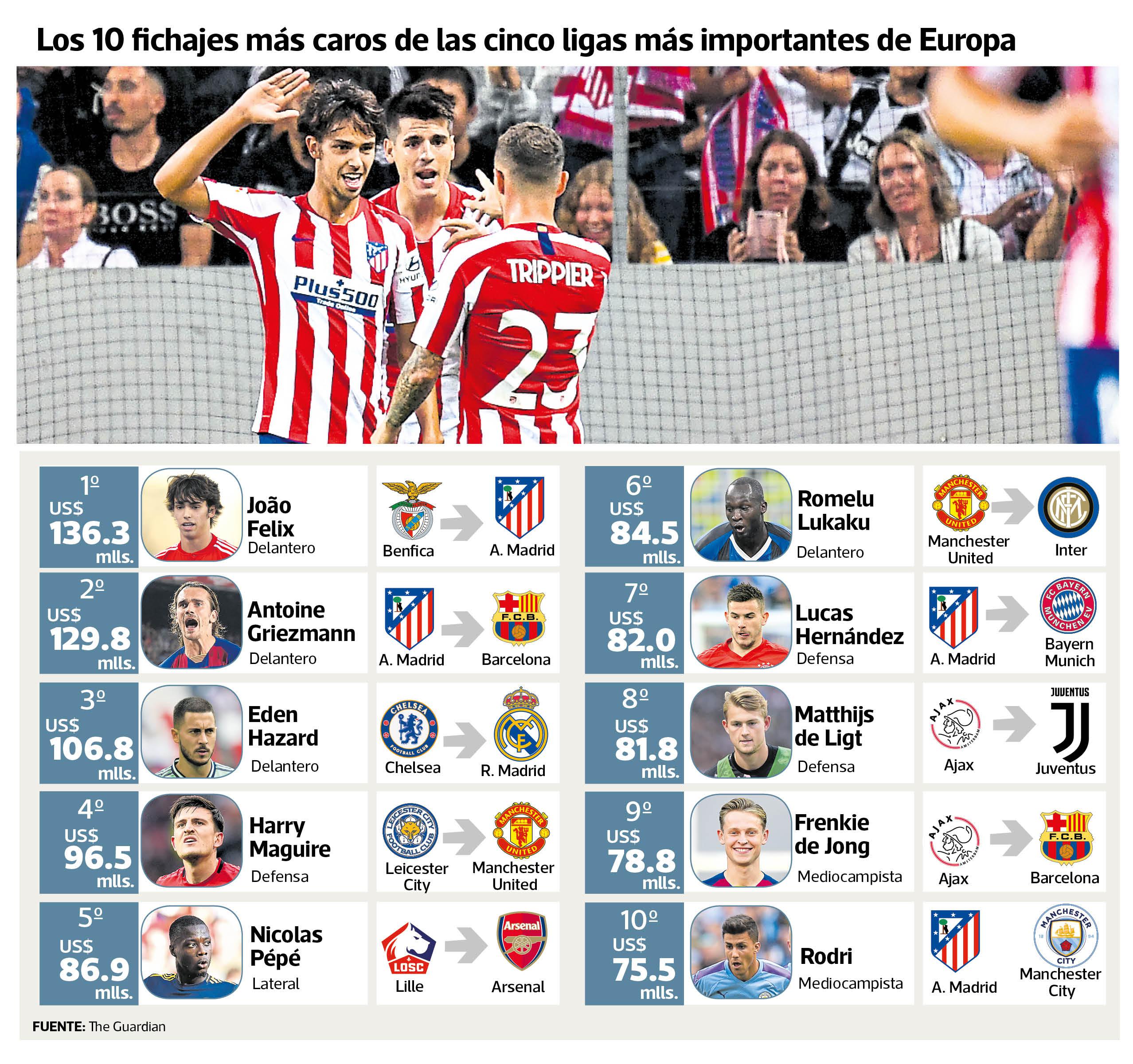 A pesar de eso, La Liga tiene los fichajes más caros. Los tres primeros lugares del top 10 (ver tabla) son compras realizadas por las escuadras más grandes de España. Entre Joao Felix, Antoine Griezmanm y Eden Hazard suman US$ 372 millones.