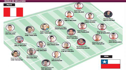 El lado peruano de la cancha suma US$ 37.68 millones. Es el valor total de los once de Sergio Markarián. Al otro extremo, la calculadora se dispara. El precio de los once de la selección chilena es de US$83. 2 millones, más de el doble, según Transfermarkt.
