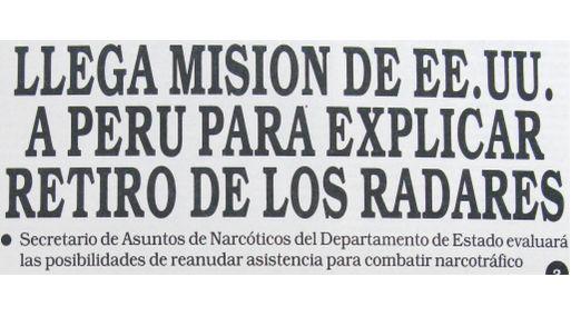 1994 Llega misión de EE.UU. a Perú para explicar retiro de los radaresSecretario de Asuntos de Narcóticos del Departamento de Estado evaluará las posibilidades de reanudar asistencia para combatir narcotráfico.